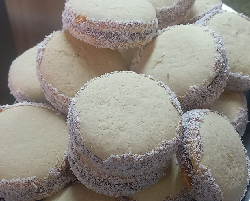 Dos suaves galletas de maicena, unidas por un dulce relleno de dulce de leche, y bordeadas de coco rallado. Un bocado que se derrite en la boca con cada mordisco.