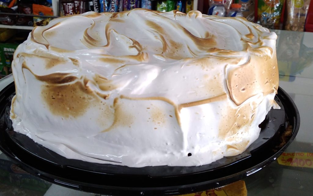 Torta de merengue: una combinación de capas ligeras de bizcochuelo, intercaladas con suave crema y adornado con merengue. Cada bocado ofrece una dulce y aireada experiencia que se deshace en la boca.